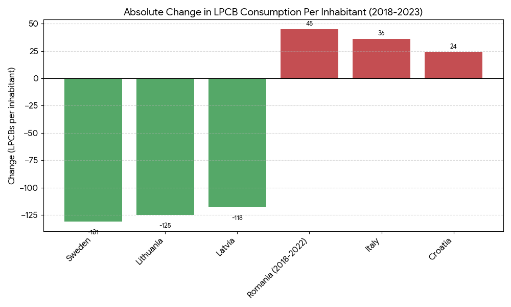 Between 2018 and 2023, several EU nations achieved substantial reductions in LPCB consumption. The most notable decreases were observed in Sweden (-131 LPCBs per inhabitant), Lithuania (-125), Latvia (-118), Spain (-104), and Cyprus (-102). However, five countries reported increases during the same period — led by Romania (+45 LPCBs; 2018–2022), Italy (+36 LPCBs), and Croatia (+24 LPCBs).