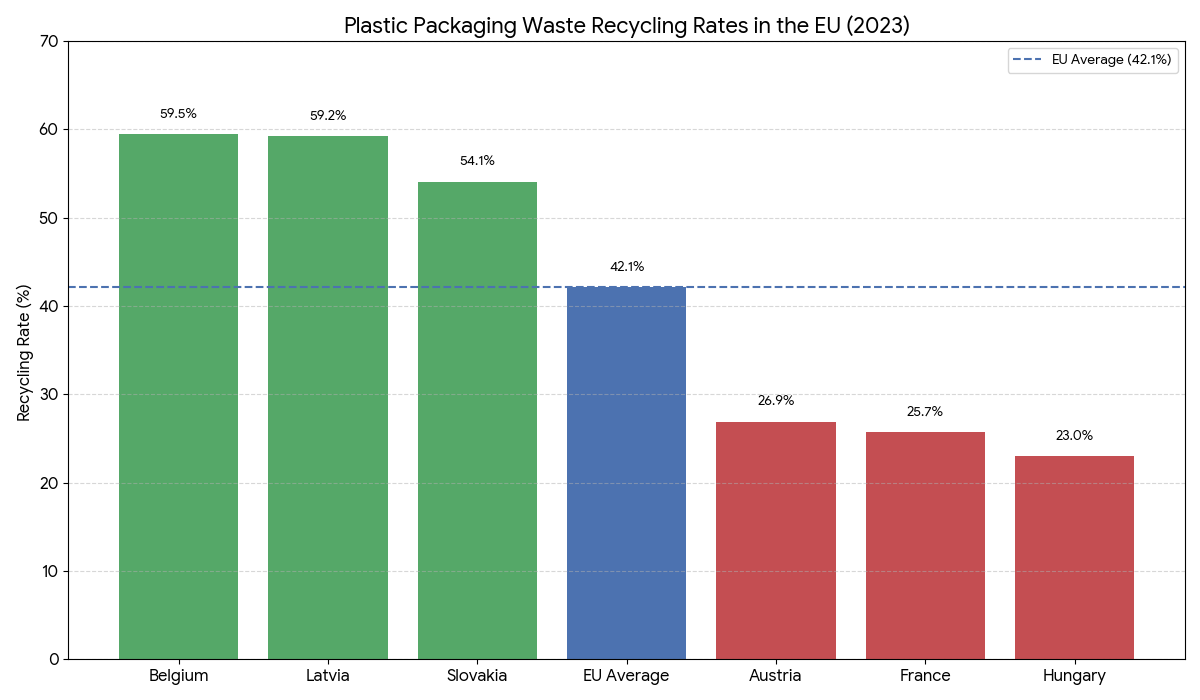 • On the other hand, several countries are lagging behind. The lowest recycling rates were recorded in Hungary (23.0%), France (25.7%), and Austria (26.9%).