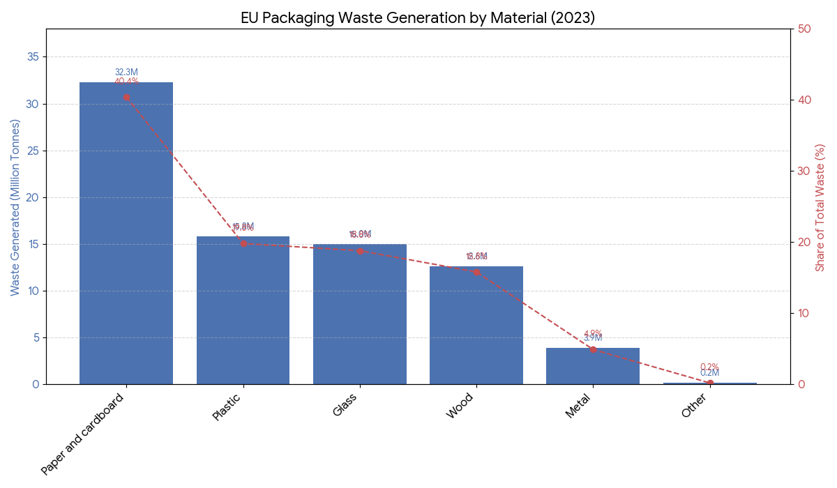 The waste is primarily composed of Paper and Cardboard at 40.4% (32.3 million tonnes), followed by Plastic at 19.8% (15.8 million tonnes), Glass at 18.8%, and Wood at 15.8%. This general distribution holds true across most member states, although Bulgaria was the sole exception where plastic waste exceeded paper/cardboard.