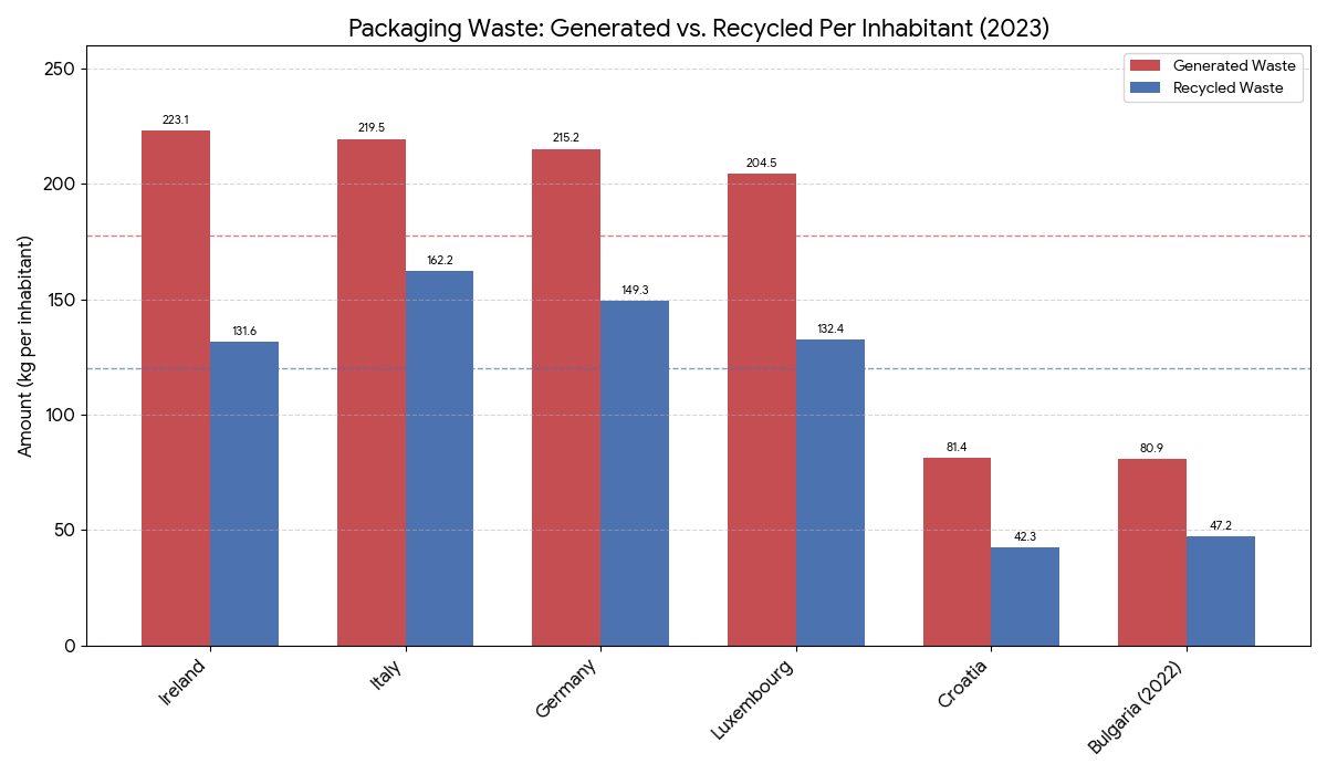 Conversely, the lowest recycling levels were recorded in Croatia (42.3 kg), Bulgaria (47.2 kg), and Romania (48.5 kg) (2022 data), reflecting their overall lower packaging waste generation.
