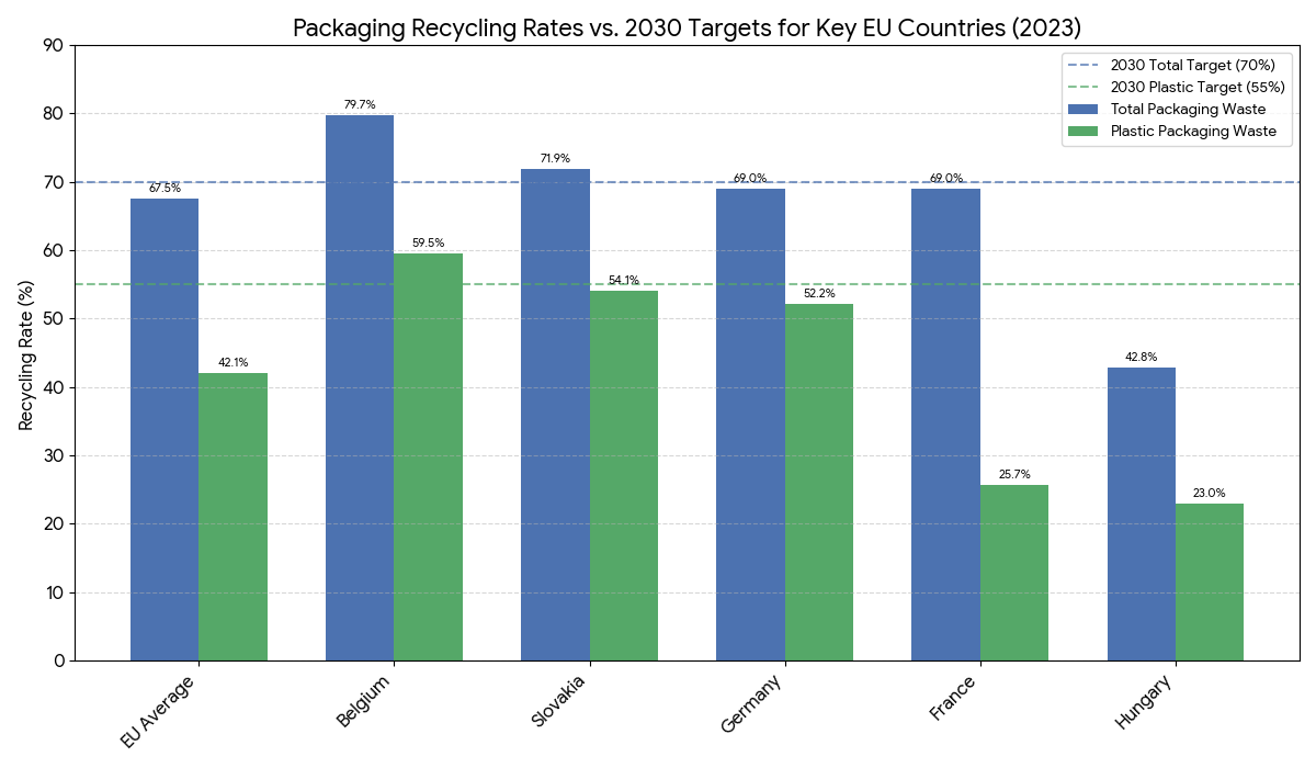 • Seven countries Belgium, Netherlands, Italy, Czechia, Slovenia, Slovakia, and Spain—have already met or exceeded the EU's 2030 target of recycling more than 70% of their packaging waste.
