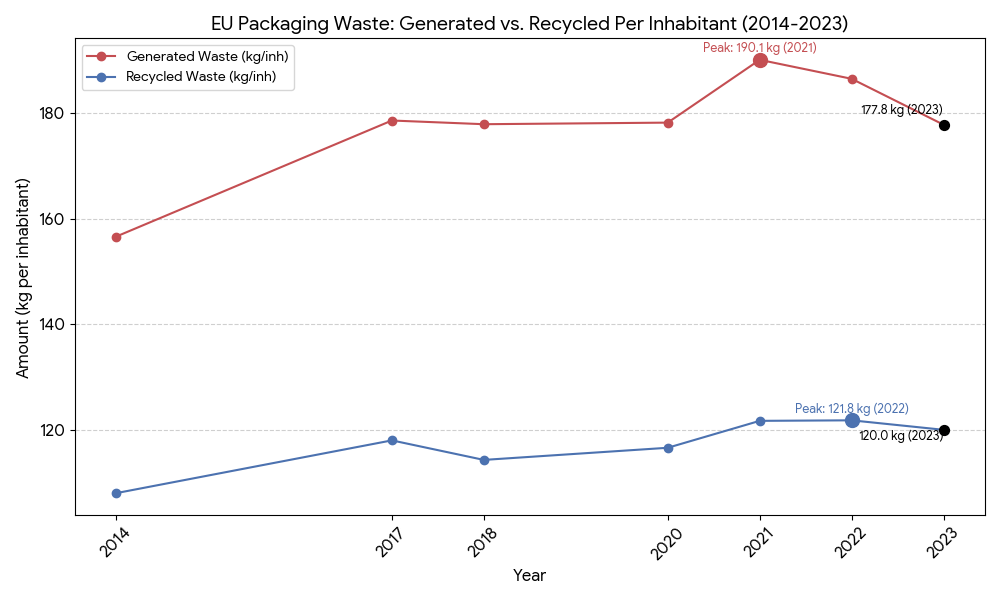 Evolution of Packaging Waste Generation and Recycling per Inhabitant in the EU (2014–2023)
