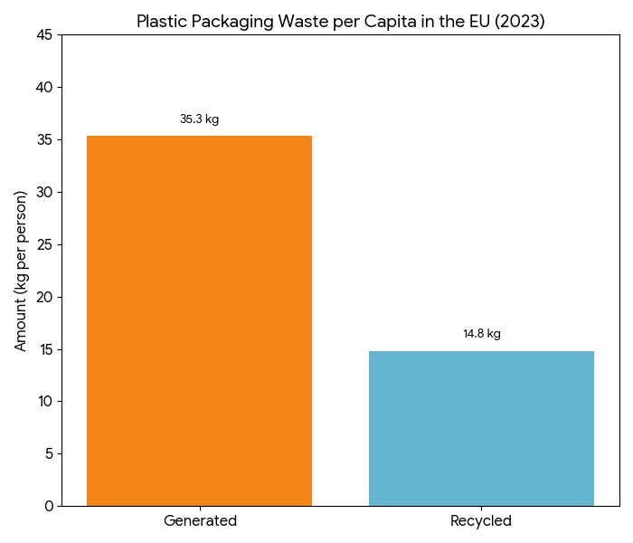 Plastic packaging waste remains a critical concern. In 2023, the average person generated 35.3 kg of plastic packaging waste, a figure that has increased by 6.4 kg since 2013.